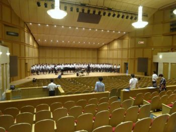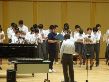 暁高等学校の岩木先生をゲストティチャーとして迎え、あいあいホールにて1・2年生の合唱練習を行いました。