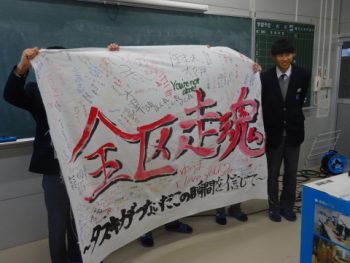 実行委員長の激励の言葉の後、駅伝部代表から意気込みを語ってもらいました。その後、生徒がつくった手書きの言葉の入った応援旗を贈呈。
