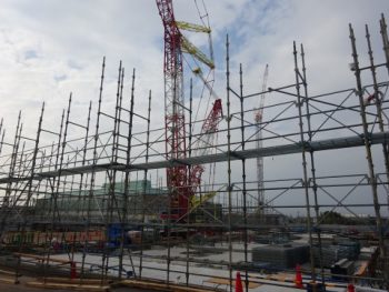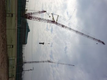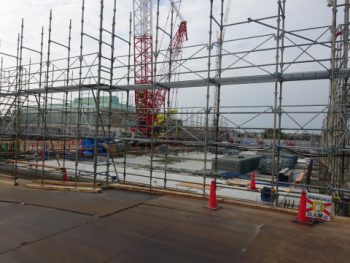現在、基礎工事が終わり、次の作業にうつったところです。ご存じの通り、川越町内ならどこからでも見ることができるような大型重機が入り、工事がすすんでいます。1年後の今頃は、ほぼ完成している予定。1・2年生のみなさん、楽しみに待っててください。