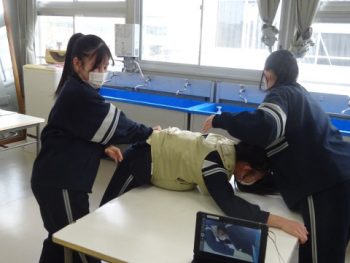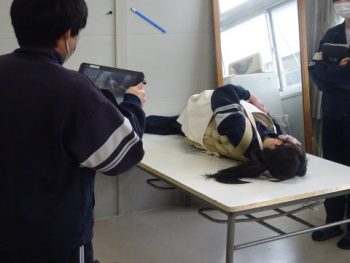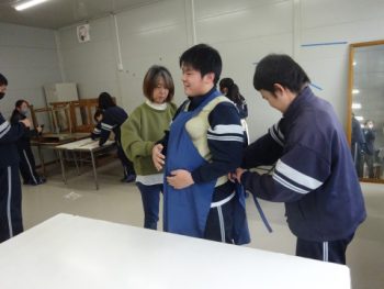 3年生家庭科の授業では、現在、妊婦体験を行っているところです。役場の子ども家庭課からお借りした妊娠体験キットを利用して、階段を歩いたり、寝返りをうったり、靴下を脱いだり、いくつかの動作を疑似体験しました。生徒たちは、予想以上に大変な体験だったようです。