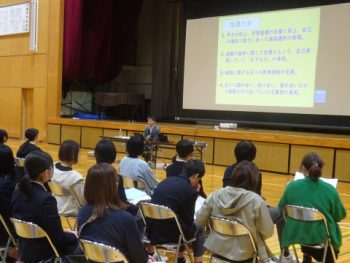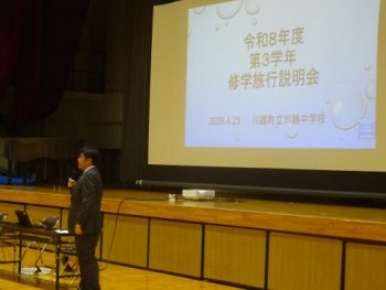 5限目、3年生と保護者対象に、修学旅行・進路説明会を体育館にて行いました。修学旅行についての行程や概要を聴き、生徒たちは楽しそうな表情を浮かべていました。進路説明会では、一人ひとりが、これからおこなう進路選択に向けて、大切にすべきことを確認する時間となりました。みんなが笑顔になれる修学旅行・進路選択になるよう主体的に行動していきましょう。