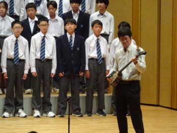 1年生の学年合唱では、松井先生が三線をもってサプライズ出場。見事な演奏でした。