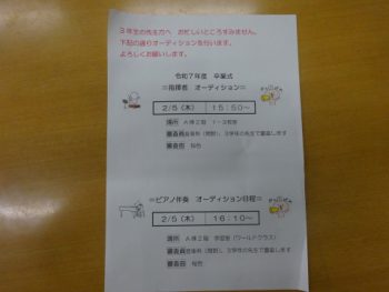 卒業式には、式歌として「桜色」を3年生全員で歌います。その際の指揮、ピアノ伴奏者のオーディションを行いました。