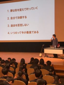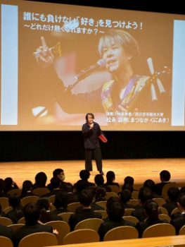 三味線ブラザーズバンドKUNI-KENのKUNIAKIさんに来校いただき、3年生を対象に講演をいただきました。自らの人生をふりかえり、「夢は形を変えて叶っていく」「自分で決断する」「過去を否定しない」「いつだって今が最高である」等の思いを語っていただきました。三味線の演奏もあり、本校音楽教員も演奏に参加しました。