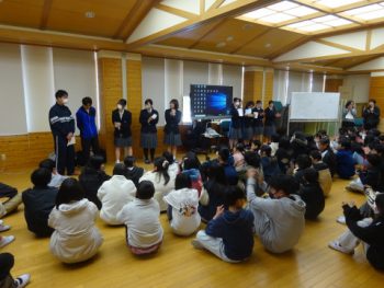 川越北小学校6年生を対象に、川越中学校の紹介を3年生(卒業生)が行いました。川越北小学校で行い、1日の学校生活の様子や部活動などを紹介。途中、クイズ形式のところもあり、みんなで盛り上がりながらの中学校の紹介でした。前回の学校見学とセットで、中学校生活を少しは具体的にイメージできたと思います。来週には南小学校に行きます。楽しみにしていてください。