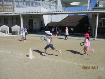 その後、年中さんがリレーをする姿がありました。最初は、直線コースで