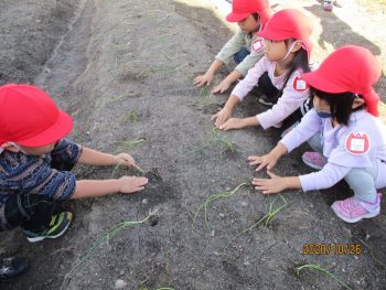 そして、きれいになった畑に、今度は年中さんが来年度に向けて玉ねぎの苗を植えました。