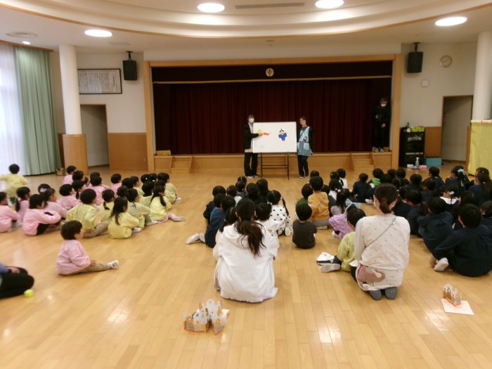 ホールに集まって、ひなまつりのパネルシアターを見ました。