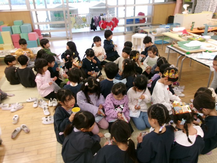 子どもたちは「カルピスもあるし、みんなで楽しいね」「ひなあられ、ハートだったよ」と友だちや教師と話しながら、ひなまつりパーティーを楽しんでいました🎵