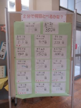 今日は、なわとび週間の最終日。なわとび集会が行われ、全学年、学級ごとに「8の字跳び」で学級の目標を超えることに挑戦しました。 1年生 2年生 3年生 4年生 5年生 6年生 2分間跳び終わったとき、あちこちで「やったあ!」の声があがっていました。今日は、記録がのびなかったという学級もありましたが、やり切った後はみんなすがすがしい表情を見せていました。本当によく頑張りましたね。