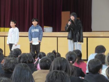 終業式「校長からのお話」では、金子みすゞ「私と小鳥と鈴と」の詩を子どもたちと一緒に読み、この2学期に自分らしさを発揮させ、自分の決めた目標を頑張ったか、或いは、自分らしさが発揮できるよう、しっかりと朝ご飯を食べ、睡眠も十分とって登校してきていたか、それから、誰かのために働こうとしたかを子どもたちに問いかけました。 そして、「冬休みの生活について」では、担当教員らが舞台に立ち、冬休みのお金の使い方を考えるための問いかけを子どもたちに向けて行いました。 子どもたちは、よく話に耳を傾け、特に高学年は、低学年の見本となって話を聞く態度が素晴らしかったと思いました。 また、終業式後に読書感想文コンクールや三泗小中科学展・社会科展の表彰を行いました。それから、代表委員会や美化委員会から2学期の学校生活についての振り返りが報告されました。 代表委員会 美化委員会 「頑張った!!」という思いがもてることは素敵ですね。今日の終業式や表彰式、委員会の発表を通して、2学期の頑張ったことを振り返ることができ嬉しく思いました。今日は、おうちでも通知表を見て、或いはおうちの人と2学期を振り返って、自分らしく頑張ったことをたくさん見つけてほしいと思います。 保護者、地域の皆様、2学期もたくさんご支援いただきありがとうございました。健康で安全に冬休みをお過ごしください。