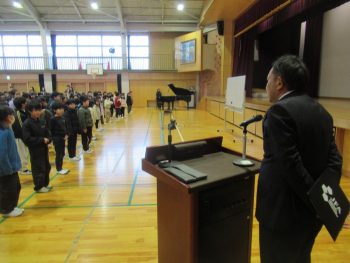 今日から3学期が始まりました。朝、通学路に立つと「おはようございます」のほかに「おめでとうございます」と会釈をしながら挨拶をする子どもたちもおり、素敵だなあと思いました。手に、これから学習で使う道具をもってきた子も多くみられました。 そして、子どもたちは、担任からのメッセージで迎えられていました。 始業式は、各学年、緊張感をもって入場し、よく話を聞けていたと思います。年の初め、そして、学年の締めくくりとなる3学期の始業式に、子どもたちは、とても素晴らしい態度で臨んでいたと思いました。 今年の干支「午」にちなんで、「馬力全開でこれまで取り組んできた“はあと❤(はたらく・あいさつ・ともだち)”を磨き上げてください。」と子どもたちに伝えました。 始業式の後は、学活や掃除を行いました。どのように冬休みを過ごしていたかを、交流したり、3学期の目標を決めたりしていました。 校舎に、また元気な子どもたちの声が戻ってきたことを本当にうれしく思います。3学期は、あっという間です。一日一日を大切にし、子どもたちとともに、笑顔いっぱいの学校づくりを進めてまいります。今年もよろしくお願いします。