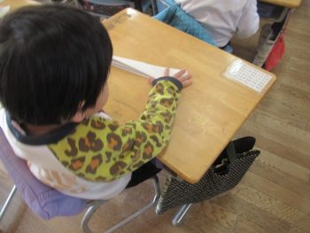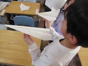 1年生が生活科の学習で“かみひこうき”を熱心に折っていました。 そして、できあがると順番にとばしてみていました。 それから、また折ってみて、また、とばして・・・・どの子も意欲満々!試行錯誤の姿が素敵でした。