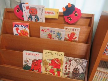図書室に行くと、鬼が出てくるコーナーがつくられていました。 私が本を手に取って読んでいると、子どもたちが寄ってきて「何、何?」「その本知っている」などと、「鬼の出てくる本」を話題に楽しいやりとりができました。こちらは、学校司書さんに感謝です。