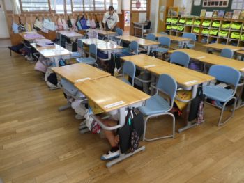 昨日予定していた避難訓練が、雨で実施できなかったため、今日の2限目に行われました。地震を想定した訓練でした。子どもたちは、地震発生の放送を受け、机の下に頭を入れて、まずは揺れがおさまるまで安全を確保しました。その後、運動場へ速やかに避難しました。どの子も真剣に避難の訓練をすることができました。学校以外の場所で、地震や津波などの災害があったときは、まずは自分の命は自分で守るように、考えて行動すること、おうちの人と離れ離れになっているときは、どこに避難するのか事前に相談しておくこと、・・・などを確認しました。