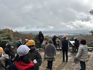 たった今、食堂でお昼を食べました。みんなとても元気です。午前中予定していたウォークラリーは、自然の家のスタッフさんとも協議をし、中止となりました。ただ、ヘルメットをして、全員で展望台まで行くことは許可していただいたので、全員で展望台に行きました。その後、体育館でレクをし、昼食を食べました。午後はバームクーヘンづくりです。