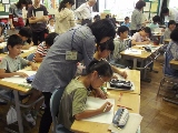 カタカナを見て子どもたちは、「ひらがなと全然違うなぁ。」「これはひらがなと似ているよ!」など、1学期の学習をもとにカタカナを覚えようとしている様子。漢字では、とめ・はね・はらいが難しいですが、何度も書き直しながらお手本そっくりに書こうと頑張っています。2015年09月25日更新|平成27年度