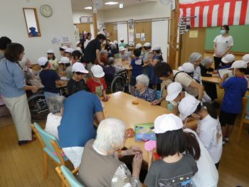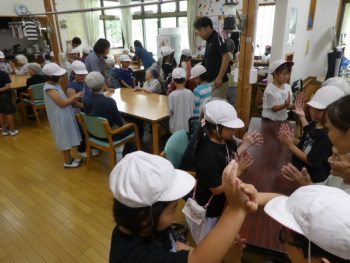 24日(水)と今日26日(金)の2回にわたって、2年生の子どもたちは学校のすぐ南側にあるグループホーム「愛の家」に訪問しました。この日に、おじいさんやおばあさんといっしょに遊ぶのを子どもたちは楽しみにしていました。最初に練習してきた歌と踊りを披露しました。そのあとは、5つのグループに分かれて手遊びや、爆弾ゲーム、トランプや折り紙などを一緒に楽しみました。帰りには、塗り絵のプレゼントをいただきました。
