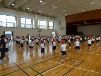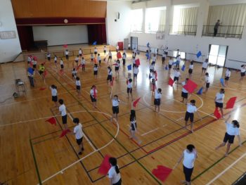 5・6年生も運動会に向けて表現種目の練習を頑張っています。組体操・フラッグ・ダンスの要素を取り入れた演目です。今は、体育館と運動場に分かれて5,6年生が別々に練習しています。5・6年生がいっしょに演技をすると、きっとすごい迫力になると思います。