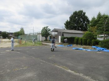 子どもたちが練習をする運動場の片隅では、ことぶき人材センターの皆様に草刈りをしていただきました。