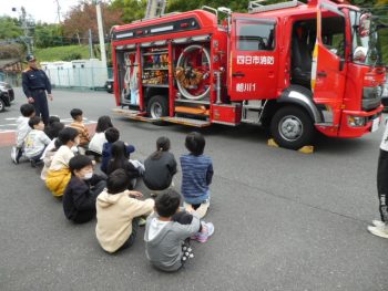 今日、3年生は、防火教室に参加しました。四日市消防署川越朝日分署の方々が学校に来てくださいました。最初に子どもたちは火の恐ろしさや防火のための取り組みの大切さについて、消防士さんのお話や映像で学びました。その後、3つのグループに分かれて、体験学習を行いました。1つは「煙の体験」です。煙を吸ってしまうと息ができなくなってしまうので、火事から逃げる時には煙がたまる高い場所を避けるように身を低くして避難する大切さを学びました。2つ目は「水消火器訓練」です。限られた消火剤を素早く炎の根本めがけて噴射させる訓練でした。3つめは「消防自動車の見学」です。消防自動車に設置された道具や機械が、どんな場面でどのように使われているのかを教えていただきました。