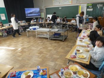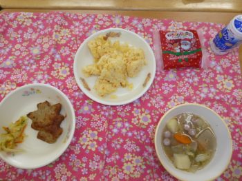 19日の給食は、2学期最後の給食でした。もうすぐクリスマスなので、メニューは「キャロットご飯・もみの木バーグ・野菜ソテー・冬野菜のポトフ・クリスマスデザート・ジョア」でした。1年に1度だけの特別なメニューに子どもたちも喜んでいました。また、ある学年ではクラス全員で机を丸く並べておいしそうに食べていました。