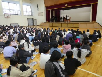 今日の1限目に2学期の終業式がありました。2学期にいろんな作品展などで優秀な成績を収めた人たちの表彰式がありました。みんなで校歌を歌った後、校長先生の話や児童会代表の話、委員会からの話がありました。その後、6年生による縄跳び発表がありました。6年生のすごい技に「すごーい!」という声や自然に拍手が起こりました。ダブルタッチを跳びながら、前跳びをする友だちもいて、みんなはびっくりしていました。