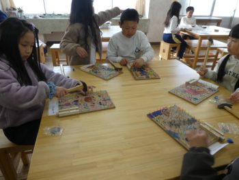 1枚目の写真は、3年生の図工の授業。作り上げたコリントゲームに修正を加えて仕上げ、友だちと交流することで、友だちの作品の工夫や楽しさを知ることができました。